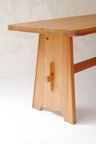 Plus jeune fils du fondateur de la société Karl Andersson, célèbre éditeur de mobilier (celui de Børge Mogensen par exemple), Göran Malmvall n'aurait pas pu aller à meilleure école. Bourré de talent, il a très vite développé son propre style en travaillant, on pourrait presque dire en sculptant, le pin massif, son matériaux de prédilection. Avec toujours un goût prononcé pour une forme de simplicité fonctionnelle, dans l'adn-même du design suédois, et un artisanat hautement qualifié. Il se distingue ainsi de ses contemporains en développant un mobilier de très grande qualité et au design très personnel, reconnaissable entre tous. Cette table illustre bien cette empreinte singulière, entre tradition et modernité. On l'aime énormément.